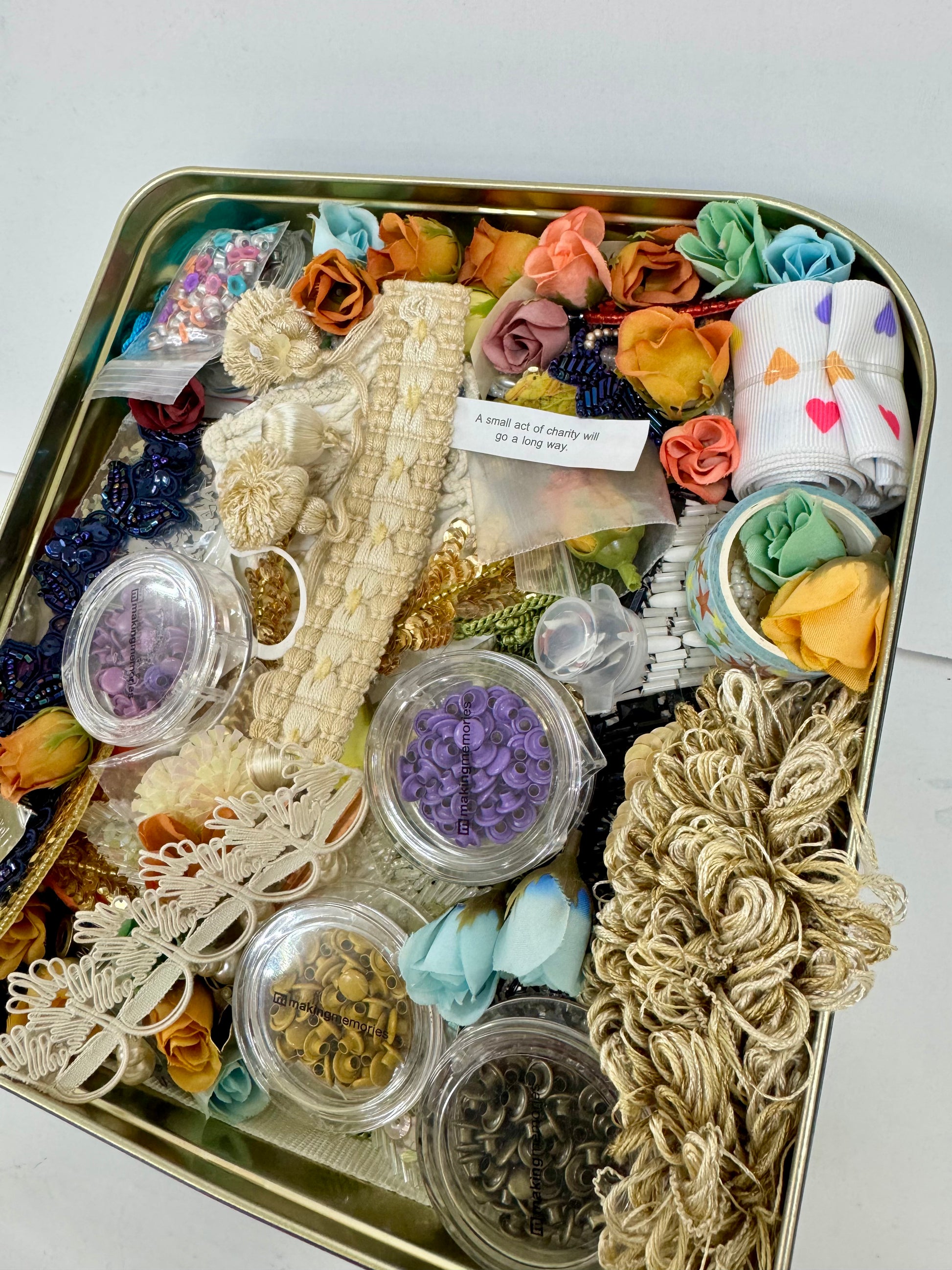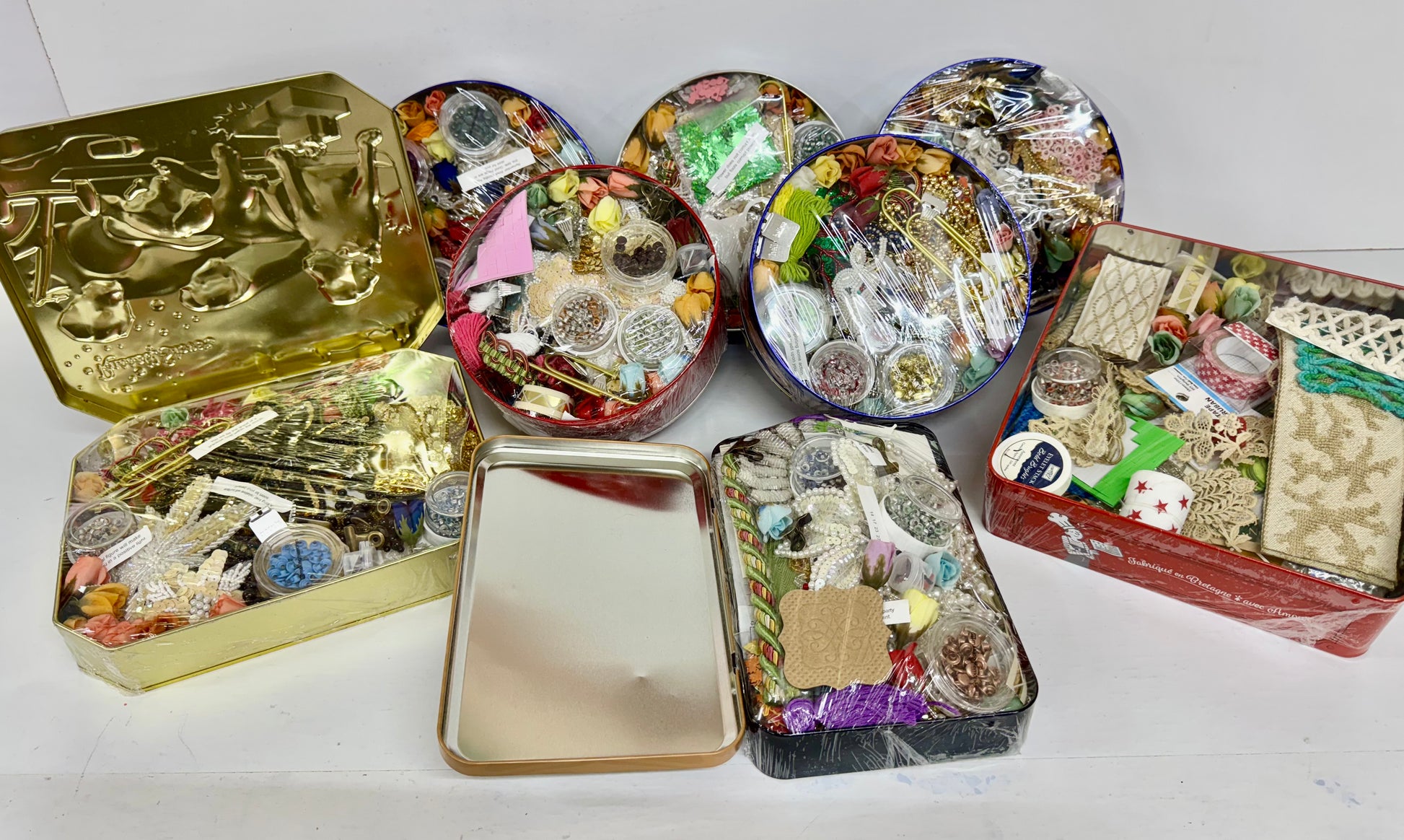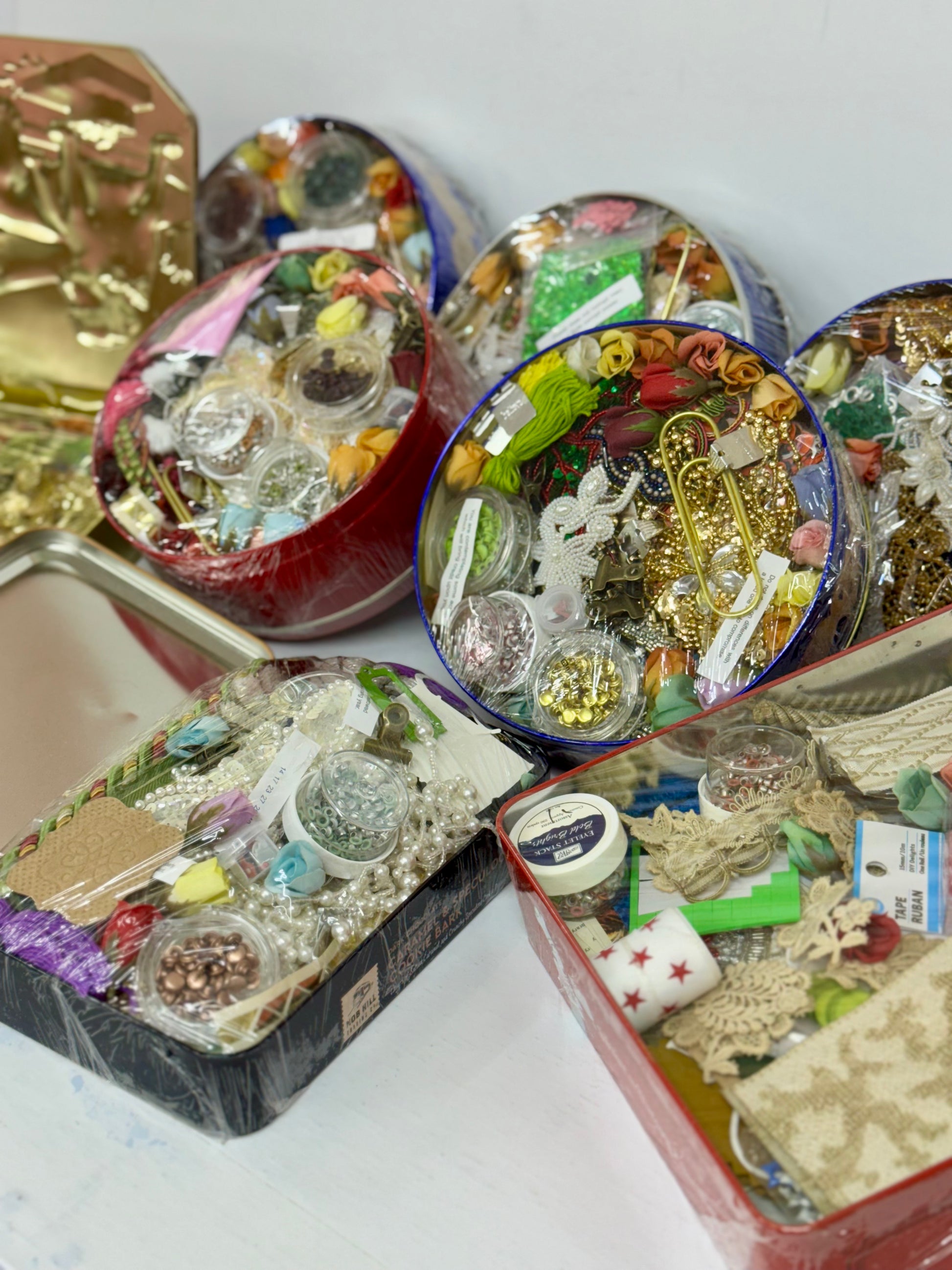 Each tin includes the same types of items (papers, trims, textures, bits & bobs), but colors and vintage trims vary, making every can its own little surprise.