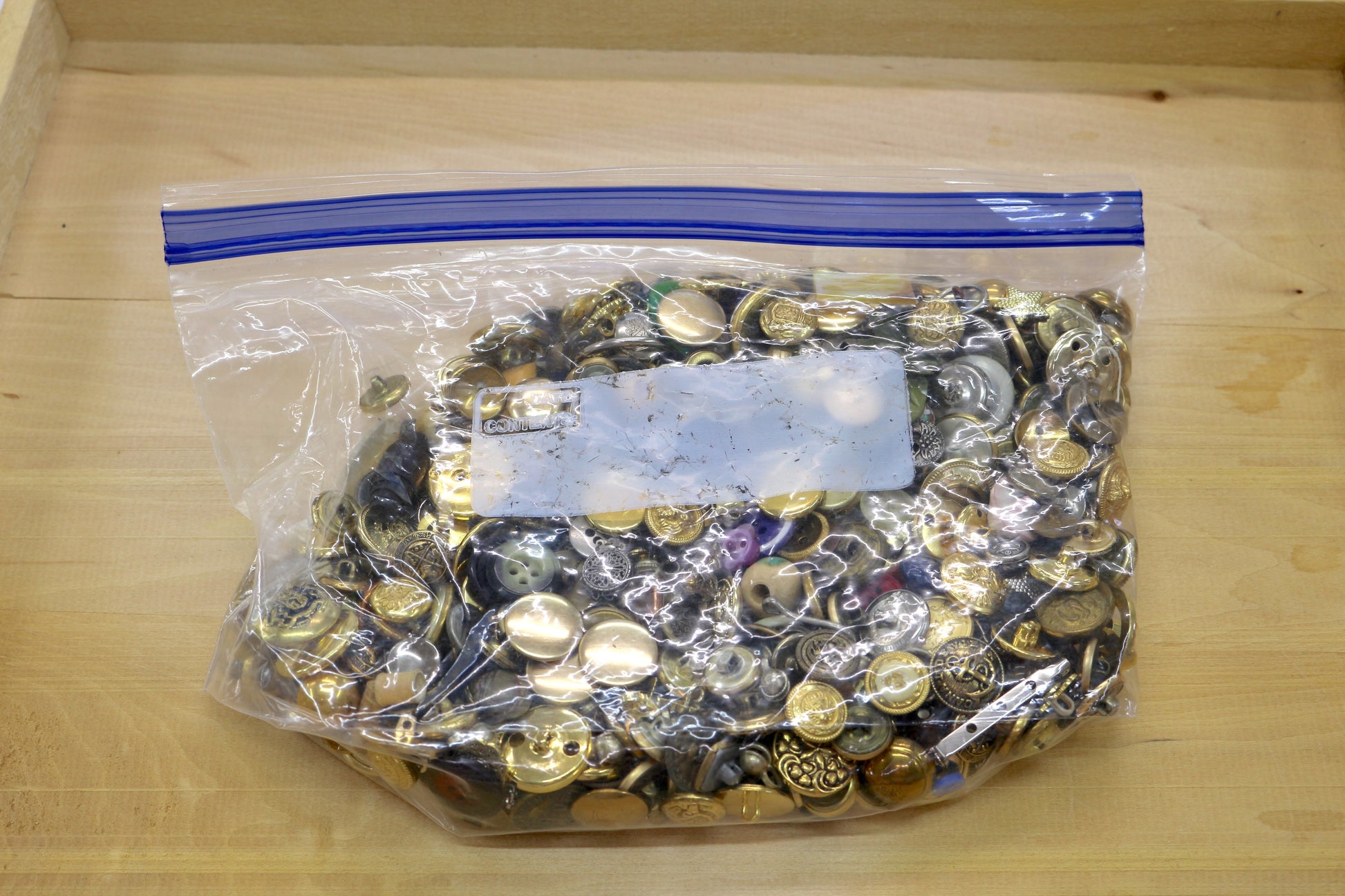 A treasure bag filled with 1.5 pounds of assorted buttons — a mix of vintage, metallic, and novelty styles ready for your next project. Perfect for sewing, crafting, collage, or embellishing mixed media art.