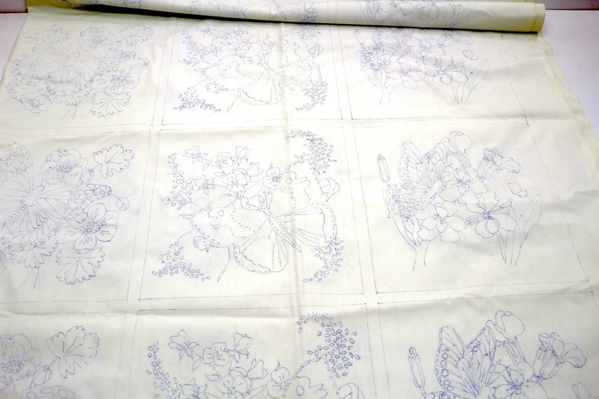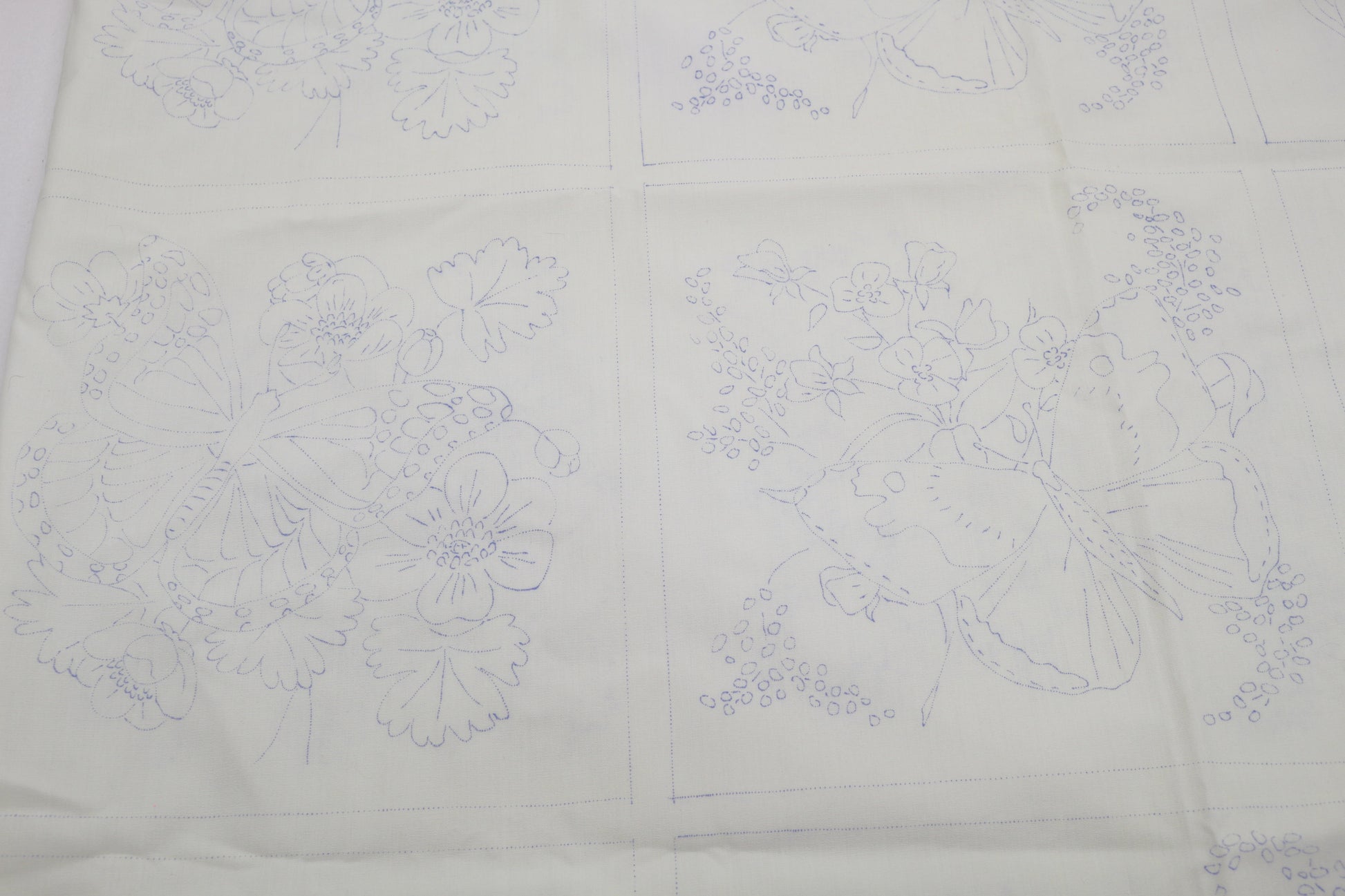 A vintage-style white cotton fabric pre-printed with delicate embroidery patterns featuring butterflies and florals. Each block measures 9" x 9", making them the perfect size for hand embroidery projects, quilt squares, or framed art.