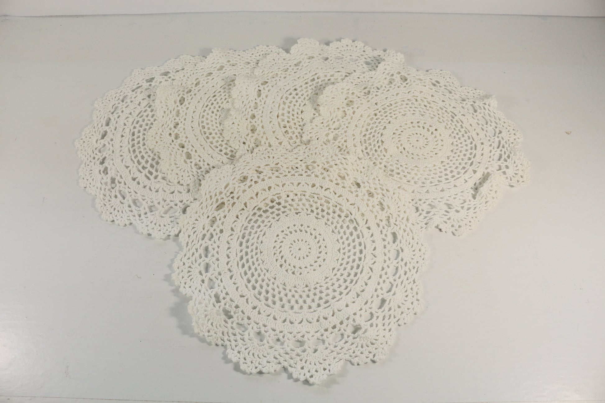 A lovely bundle of white cotton doilies 10", crocheted with beautiful lacework and delicate patterns. Perfect for sewing projects, textile art, slow stitching, junk journals, collage, home décor, and layering in creative displays.