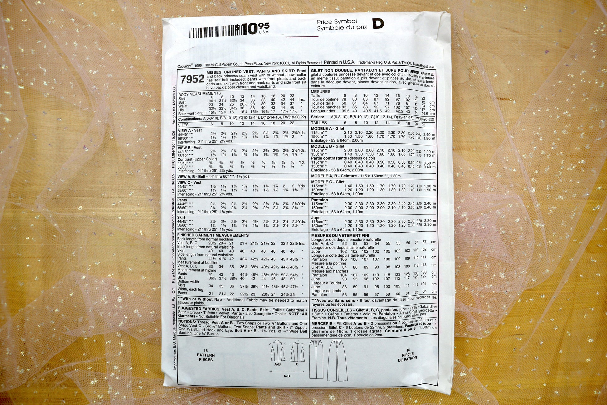 McCalls 7952 Misses' Vest, Pants & Skirt Sewing Pattern 8-12
