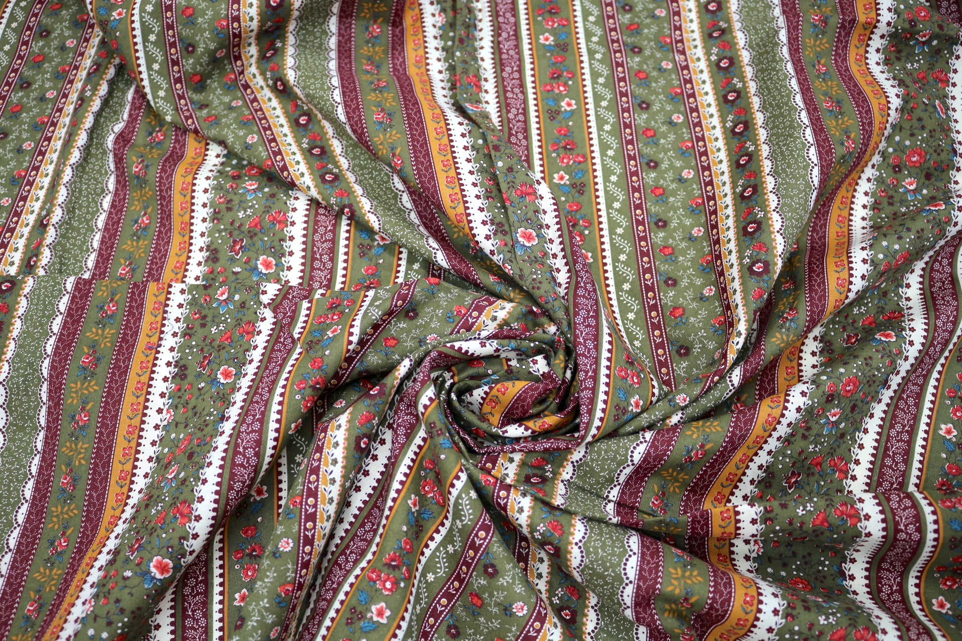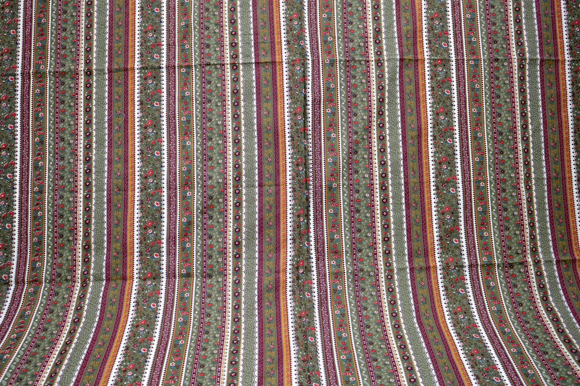A charming striped cotton with floral accents in earthy tones of olive green, burgundy, mustard, and cream. The repeating pattern gives it a vintage feel, perfect for quilts, table linens, or craft projects with a cozy countryside touch.