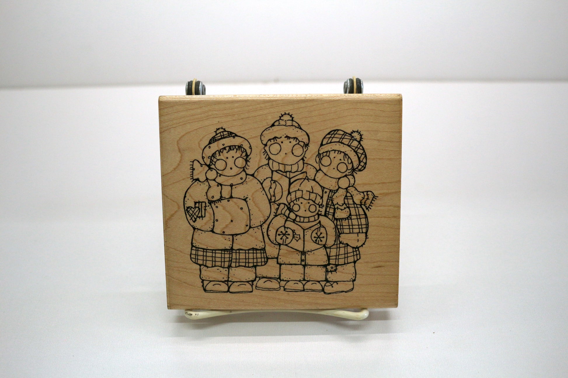 Meet Merry Carolers — a charming vintage wood-mounted rubber stamp featuring a sweet bundled-up family ready to sing their holiday hearts out. The stitched, Raggedy Ann–style illustration makes this stamp perfect for adding cozy nostalgia to your winter crafting.