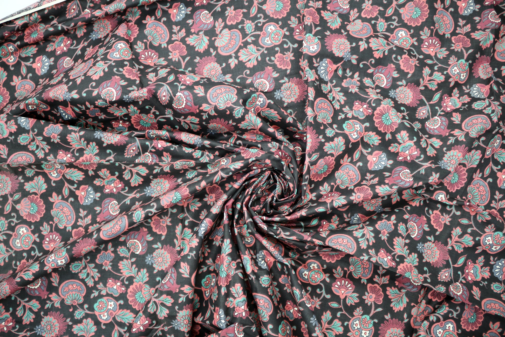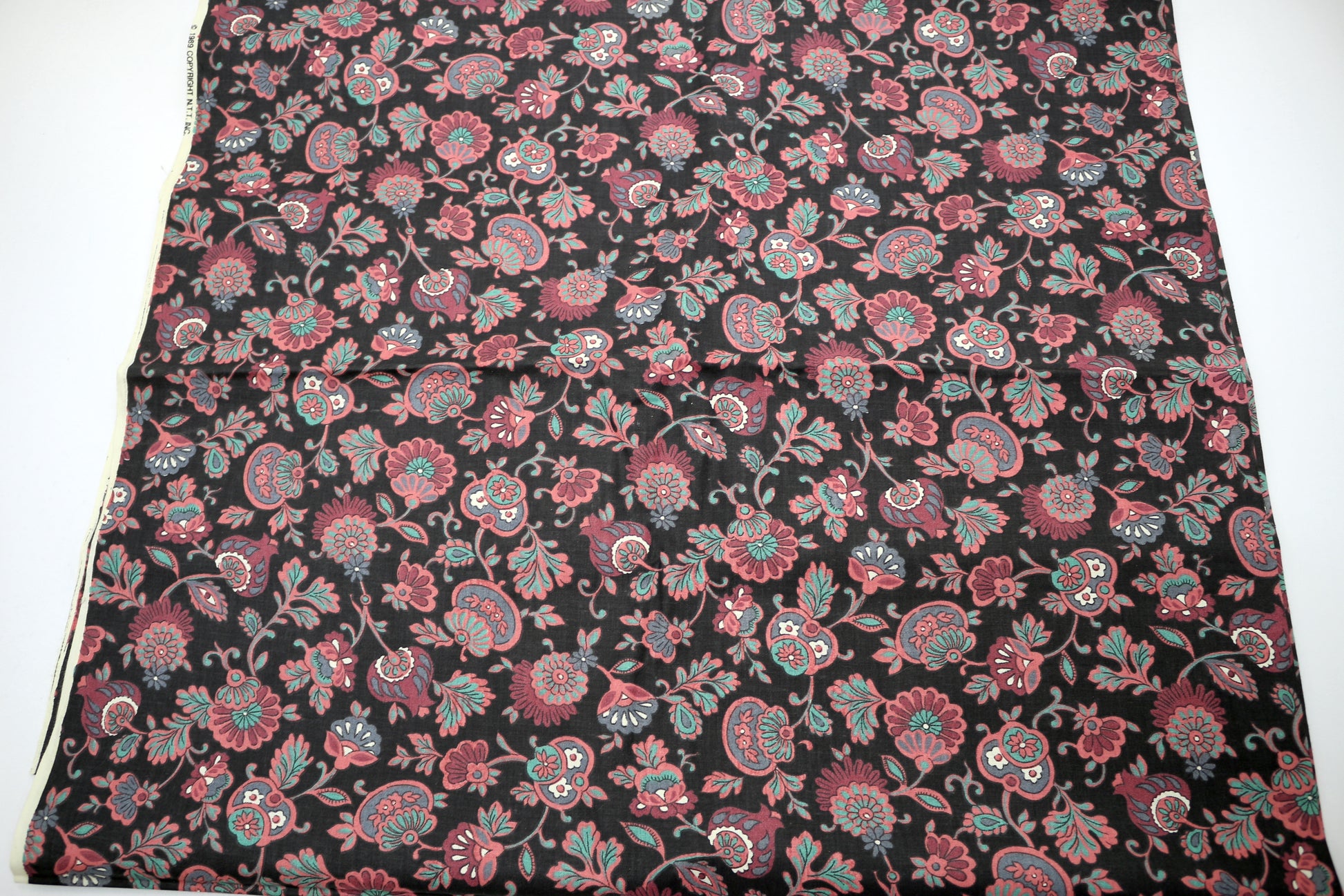 A soft cotton fabric with a dark background covered in vintage-style florals and paisleys in shades of red, green, and gray. Perfect for quilting, sewing, or adding a floral pop to craft projects.