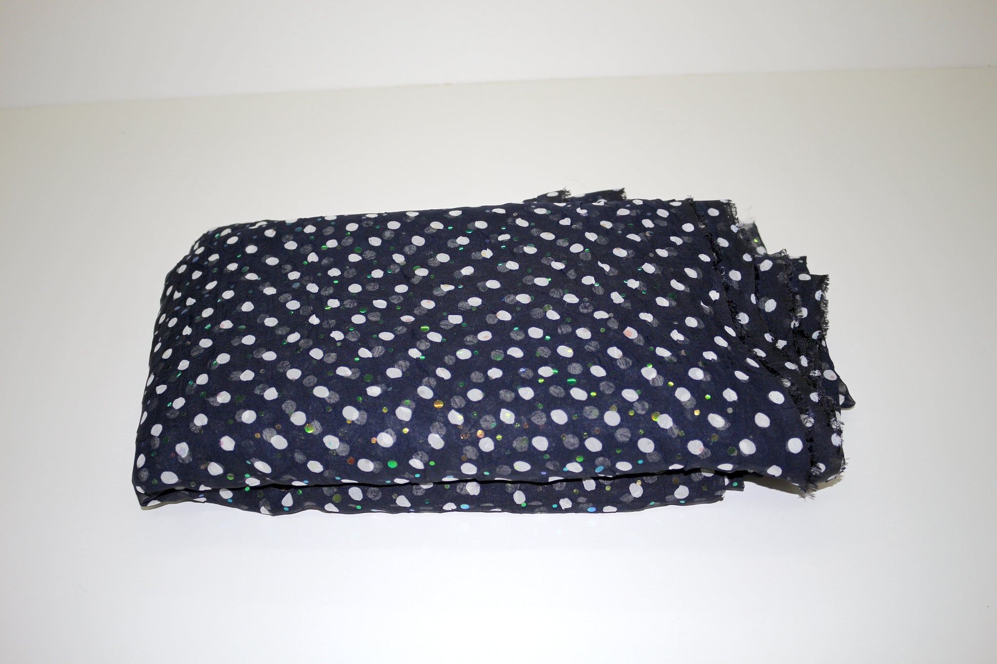 This sheer navy fabric shimmers with scattered white polka dots and subtle sequins that catch the light beautifully. It’s soft, drapey, and adds just the right touch of sparkle to your creative projects.