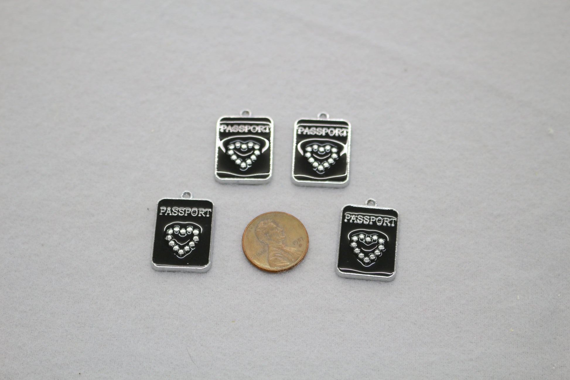 Mini passport charms with a crisp black finish, perfect for travel-inspired jewelry, scrap projects, or charm bracelets. Secondhand and ready for creative reuse.