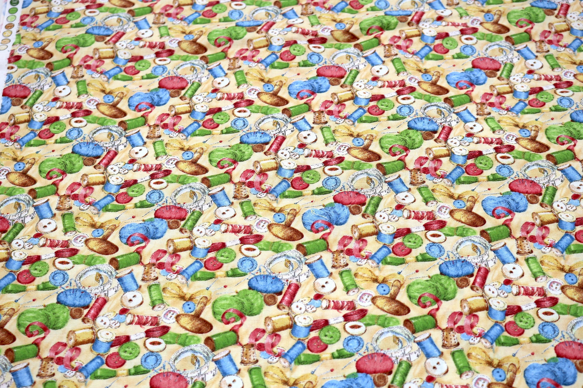 A cheerful cotton print filled with colorful spools of thread, buttons, scissors, and other sewing notions — perfect for anyone who loves to sew or craft!