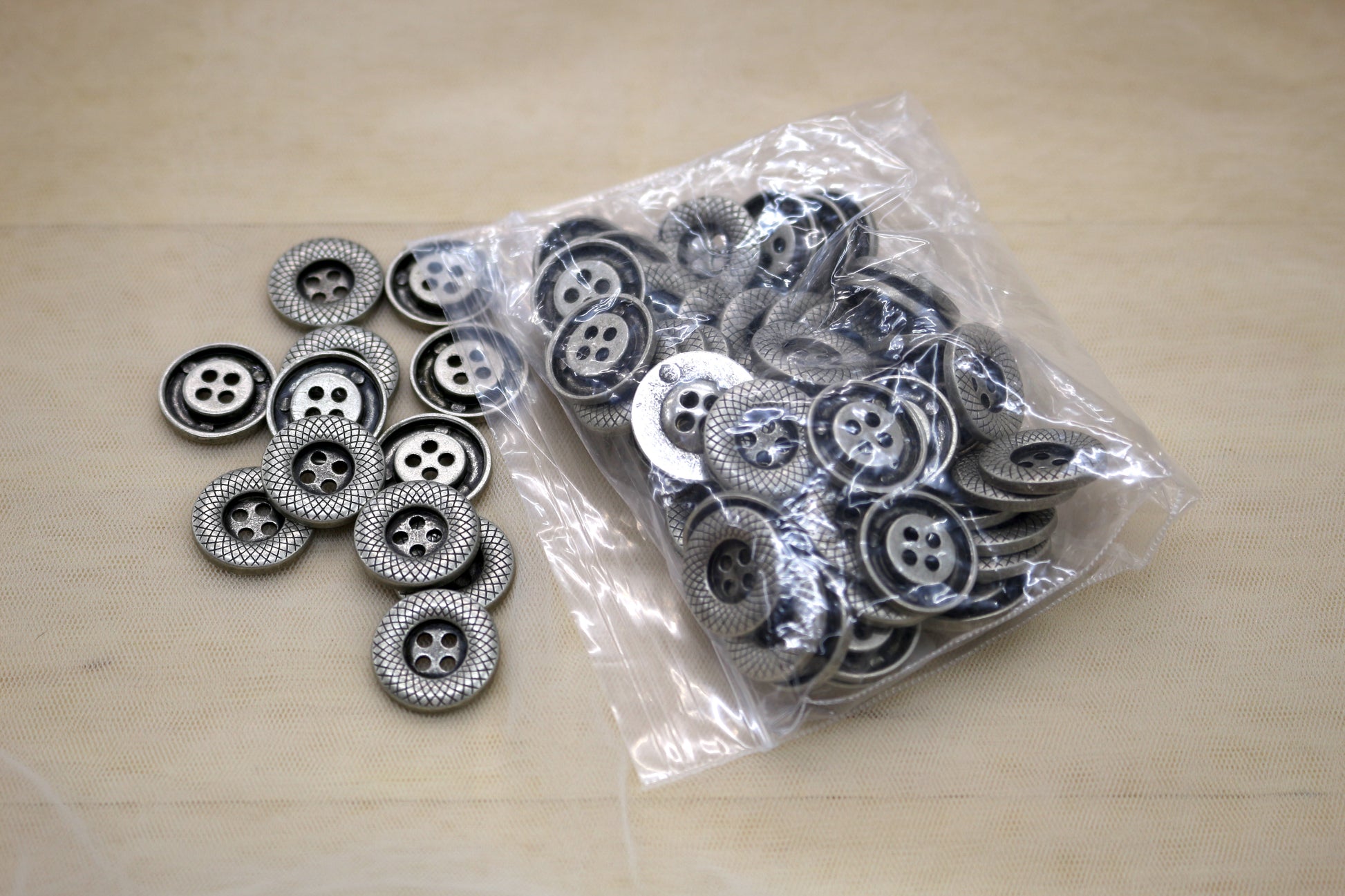 A lot of silver to gunmetal–tone metal buttons with a subtle textured ring and 4 holes. Clean, modern look with nice weight. Great for jackets, coats, bags, uniforms, and mixed-media projects. Secondhand and saved from the landfill.