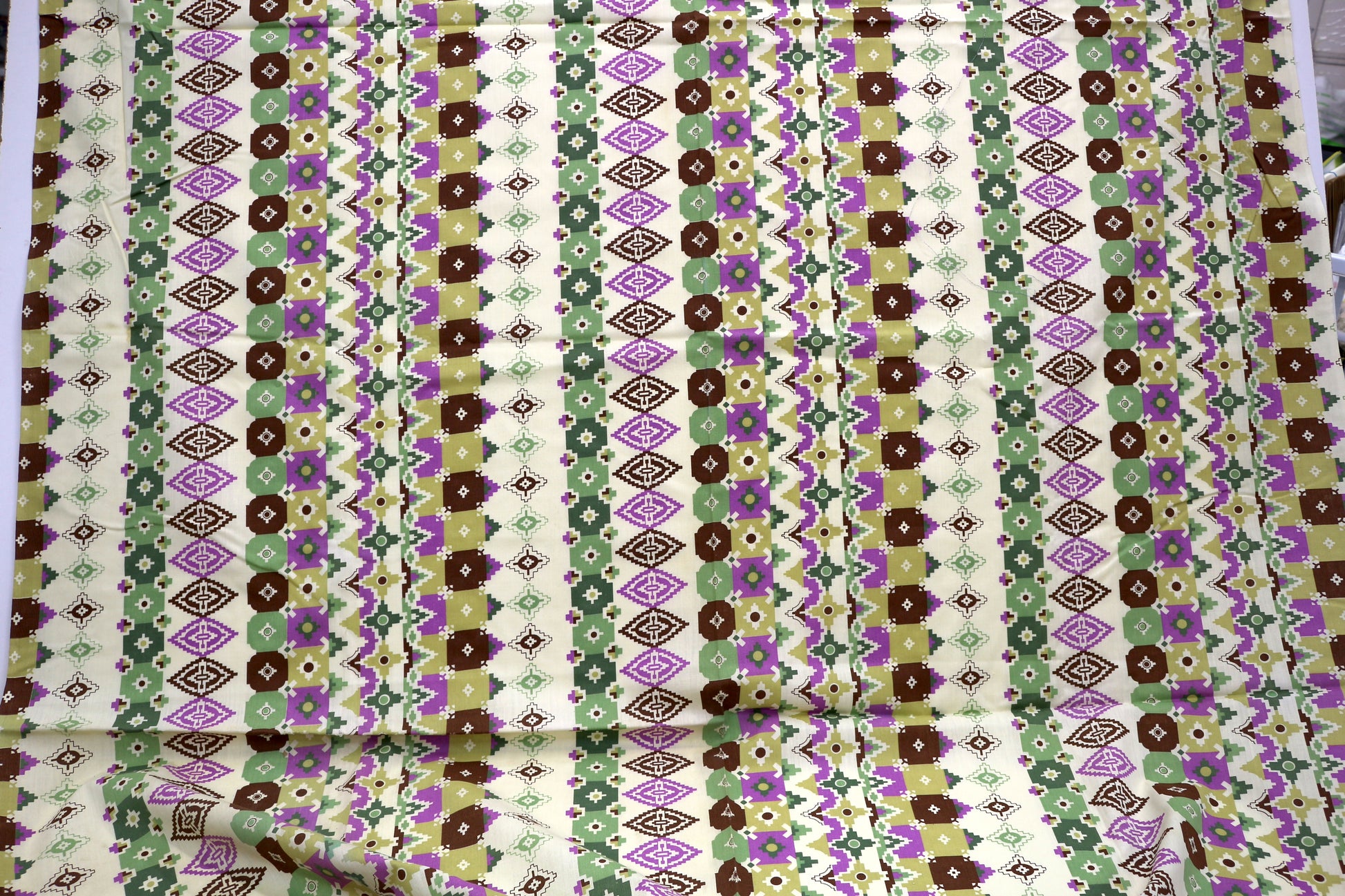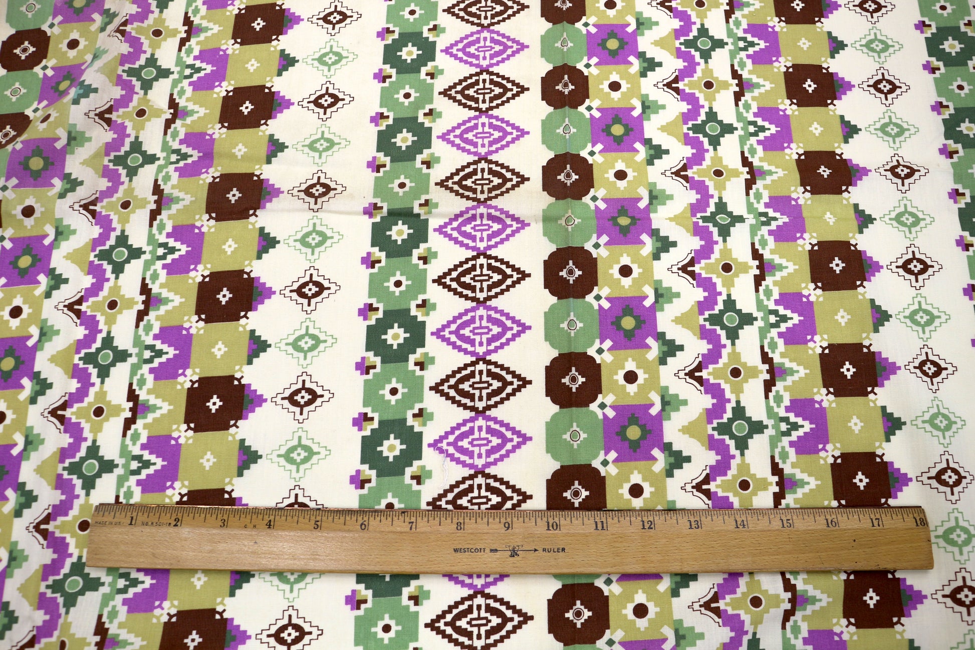 Bold cotton fabric with a geometric stripe design in earthy green, brown, tan, and pops of purple. Perfect for quilting, statement sewing projects, or adding a touch of Southwestern flair to home décor.