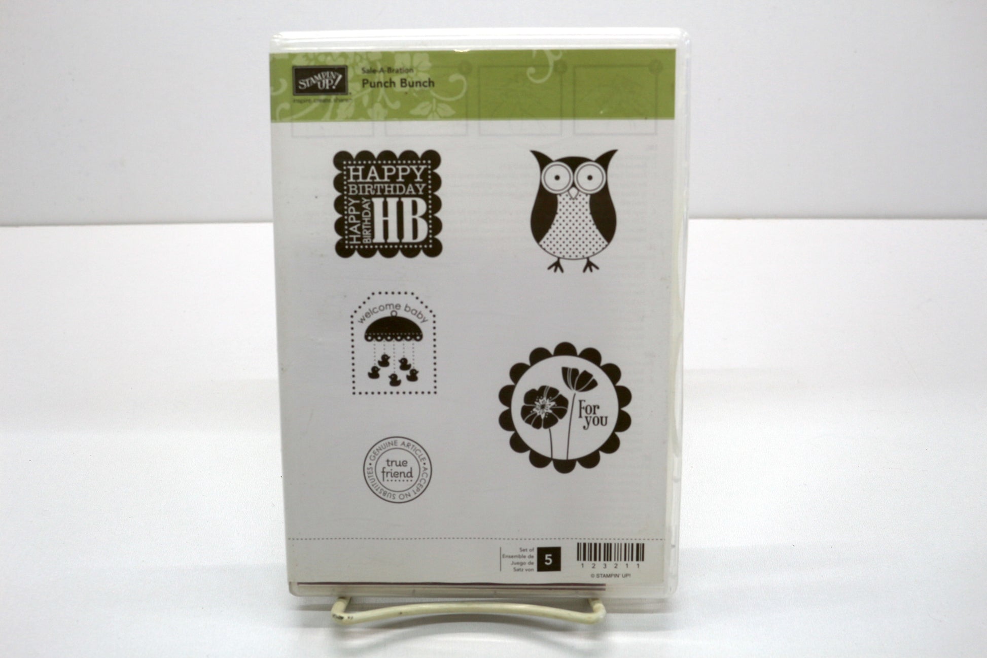 Give your projects a playful pop with this Stampin’ Up! Punch Bunch stamp set! This five-piece red rubber set features some of Stampin’ Up!’s most loved designs—including the adorable owl, scalloped birthday square, “For You” floral medallion, sweet baby tag, and “true friend” circle. Each stamp is designed to coordinate perfectly with popular Stampin’ Up! punches, making it easy to add crisp sentiments and fun accents to cards, tags, journals, and handmade gifts.