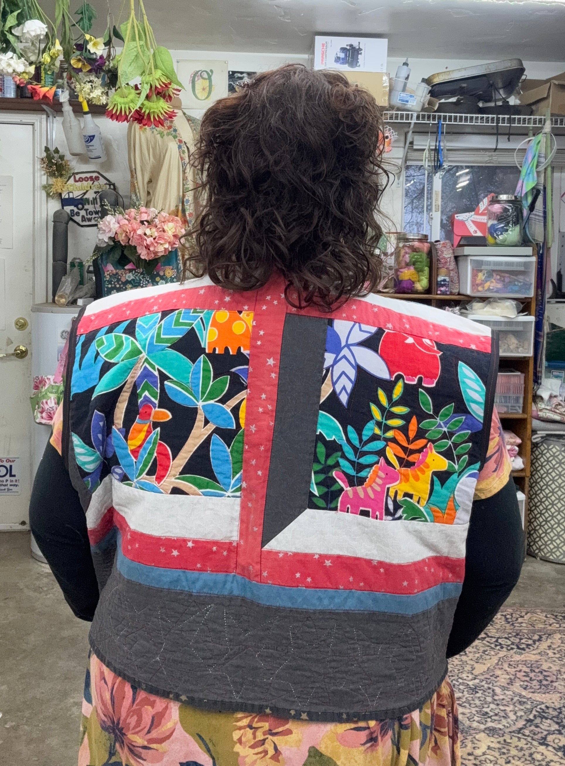 This one-of-a-kind vest was handmade from a baby blanket and transformed into a bright, playful layering piece full of color and personality. Featuring cheerful animal motifs, bold leaves, and star accents, this vest feels nostalgic and fun while still being totally wearable.