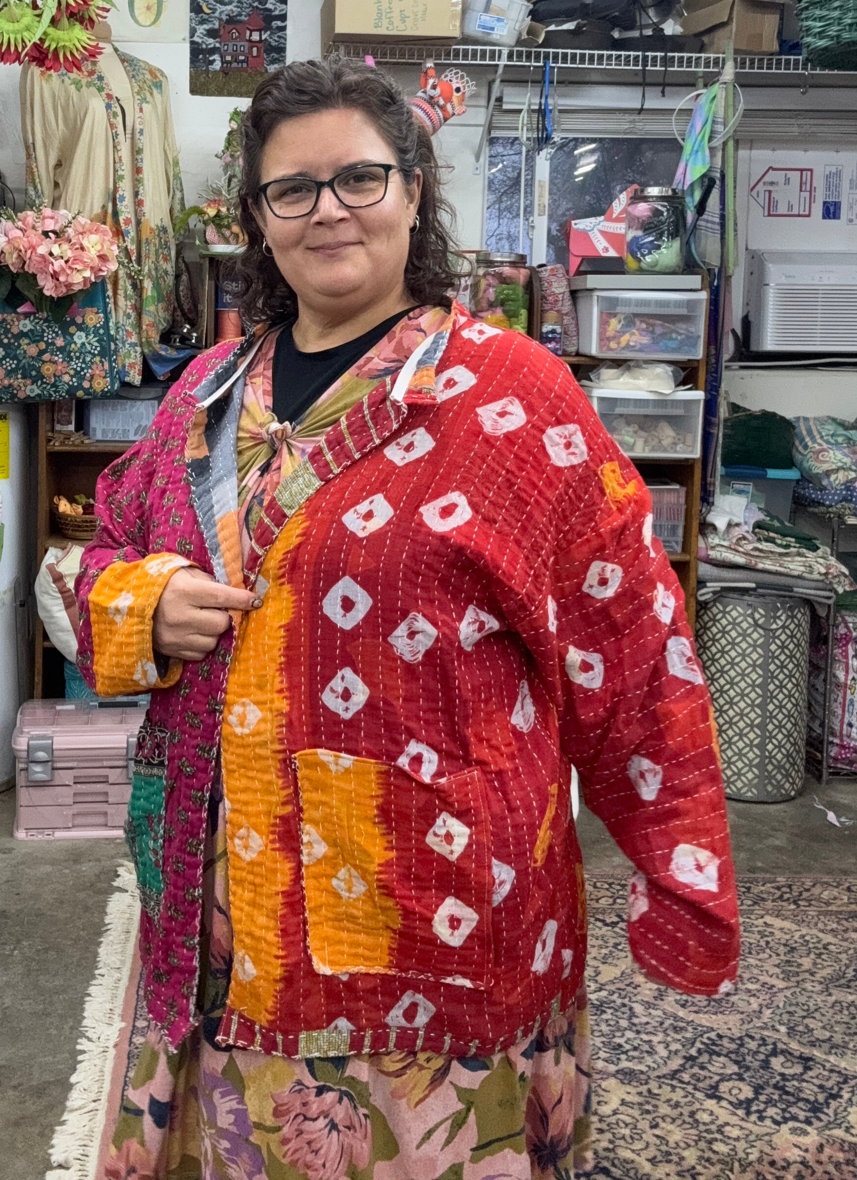 This one-of-a-kind lightweight jacket was handmade from a vintage Kantha blanket, carefully upcycled into a wearable, artful layer. Kantha textiles are traditionally stitched by hand, and those running stitches tell a quiet story of reuse, repair, and beauty built over time.