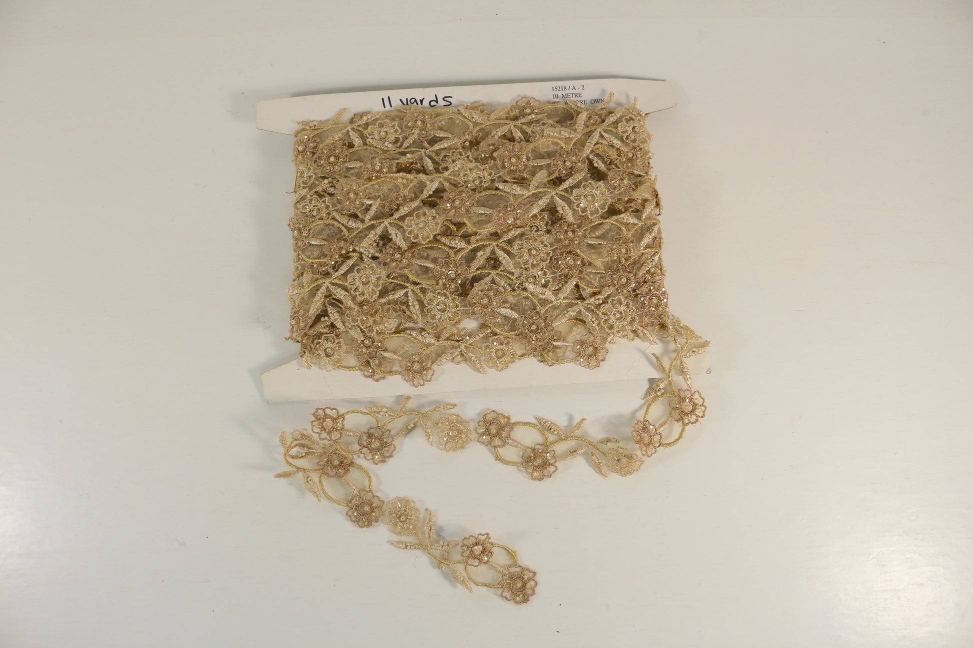 A stunning roll of vintage floral lace trim featuring delicate embroidery, soft gold tones, and subtle beaded accents. This trim has a dimensional, garden-like pattern that’s perfect for bridal sewing, heirloom garments, costume design, millinery, textile art, and special embellishment projects.