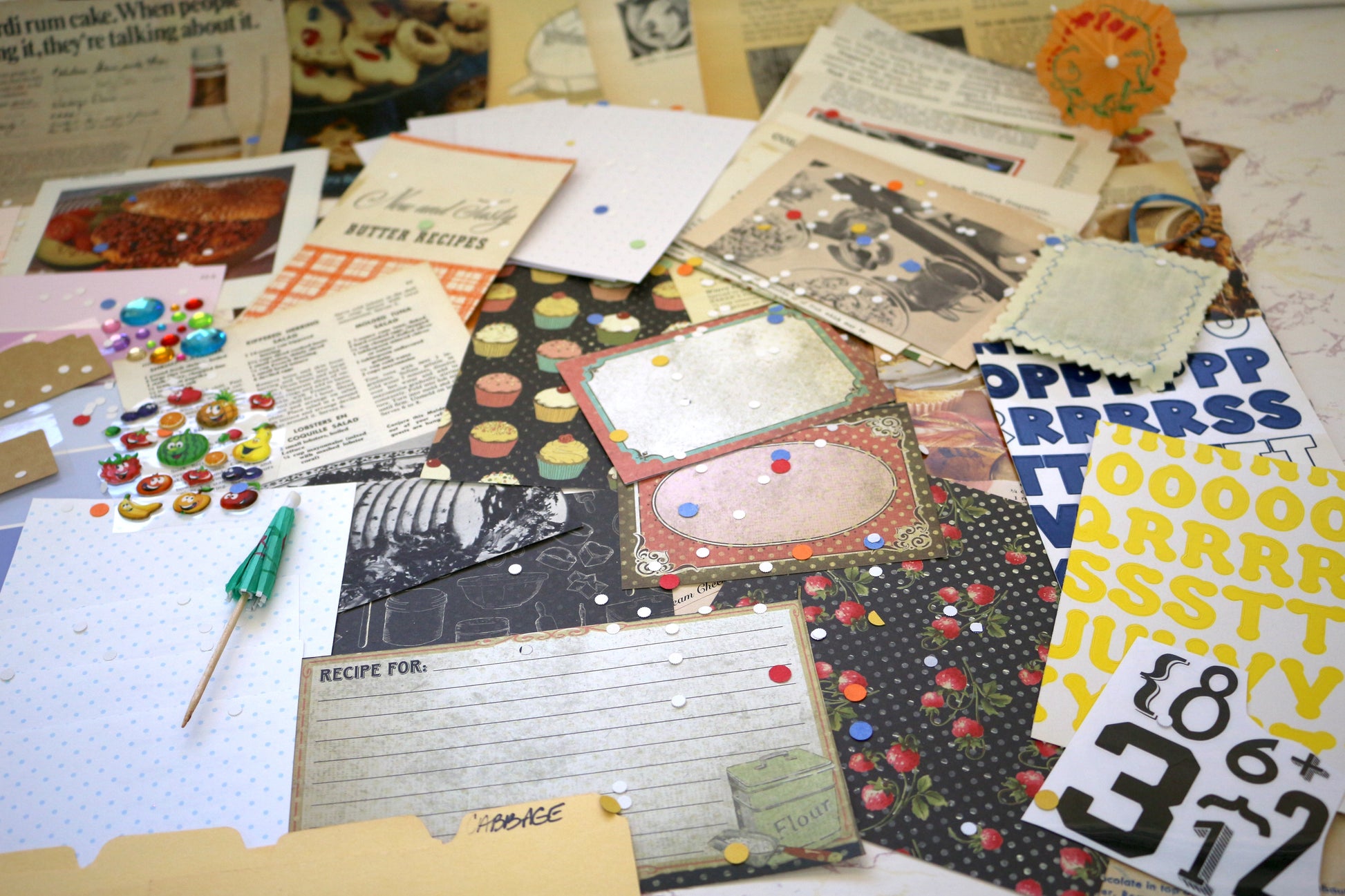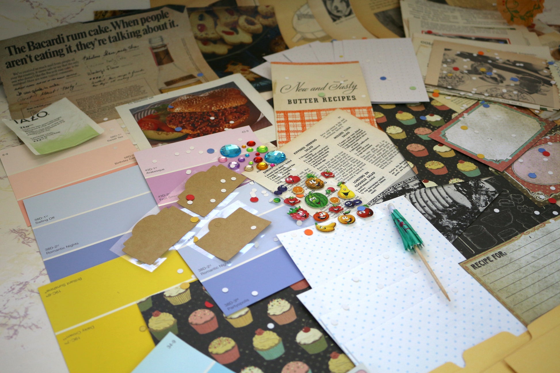 Dive into a culinary adventure with our curated food-themed kits, each packed with over 75 pieces of vintage charm. Perfect for scrapbook enthusiasts, crafters, and food lovers alike, these kits include a delightful mix of vintage food ads, recipes, labels, drink umbrellas, and scrapbook paper.