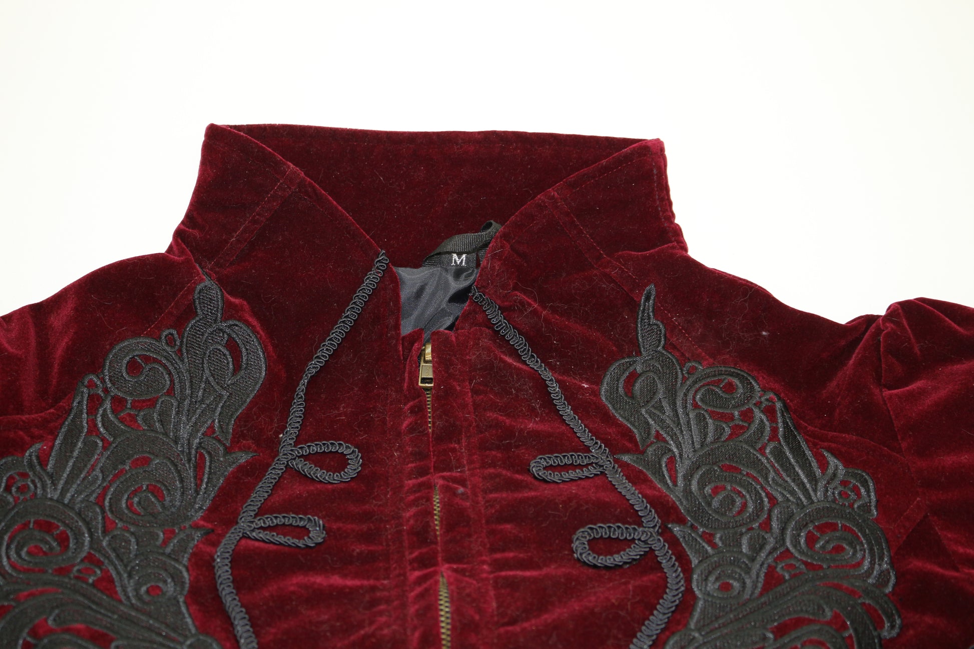 Vintage Red Velvet Jacket with Black Embroidery – Women’s Medium – Romantic Gothic Style