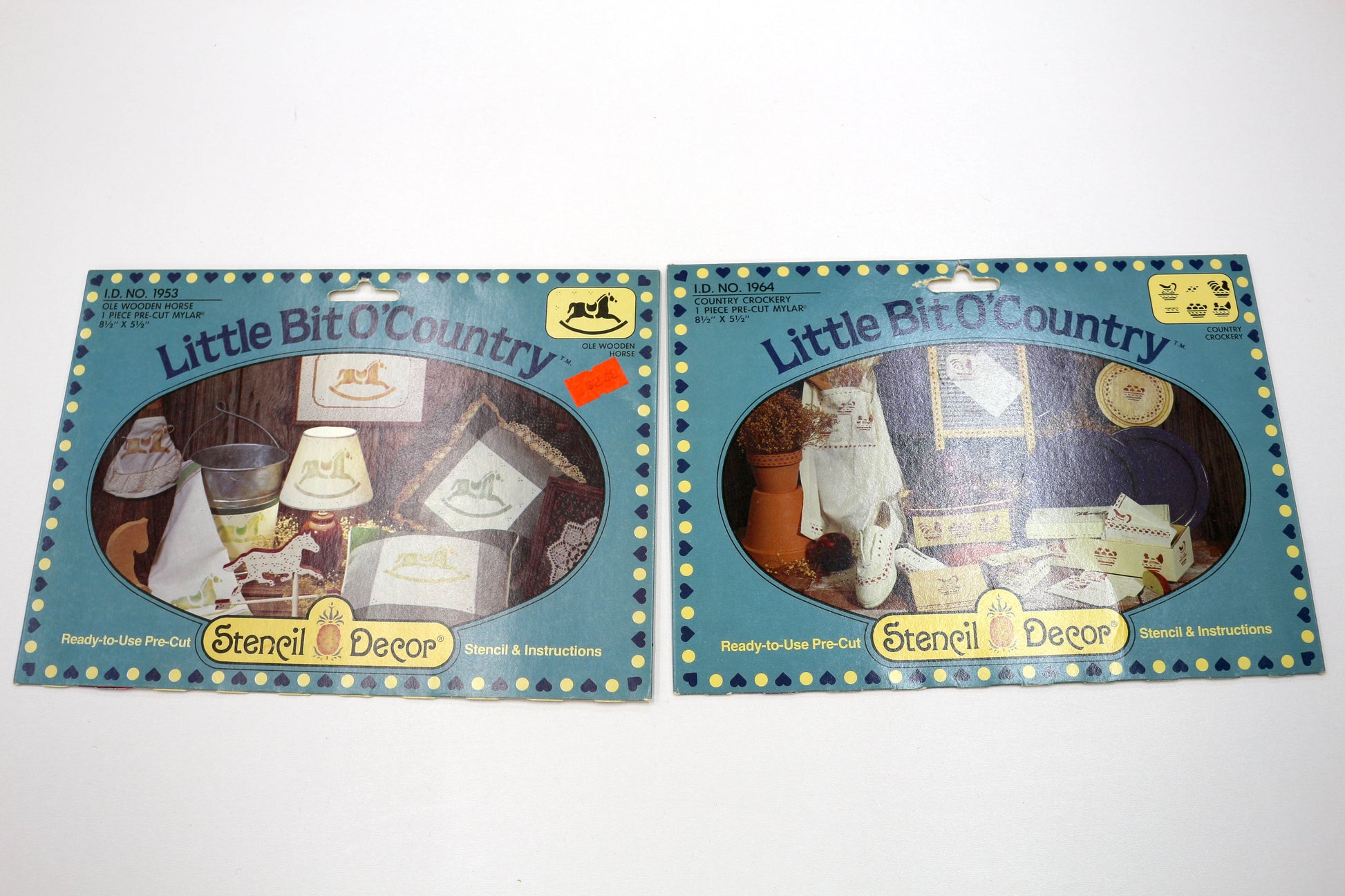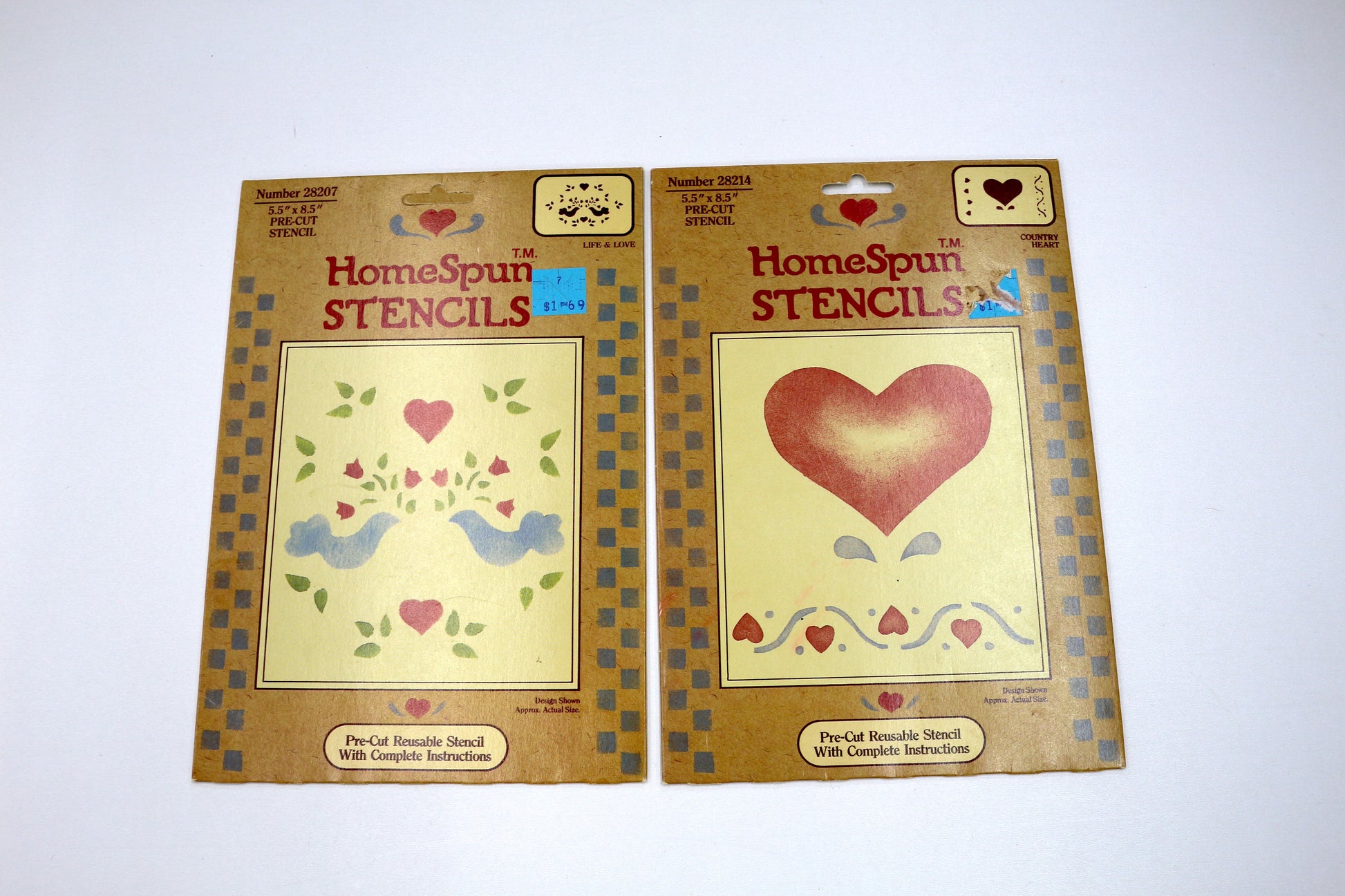 A charming bundle of vintage stencils featuring sweet Homespun and Bit O’ Country themes—think teddy bears, hearts, bows, and folk art motifs. These reusable plastic stencils are perfect for giving new life to furniture, fabric, cards, and home décor. Some packages have been opened and used, but all still have plenty of creative potential.
