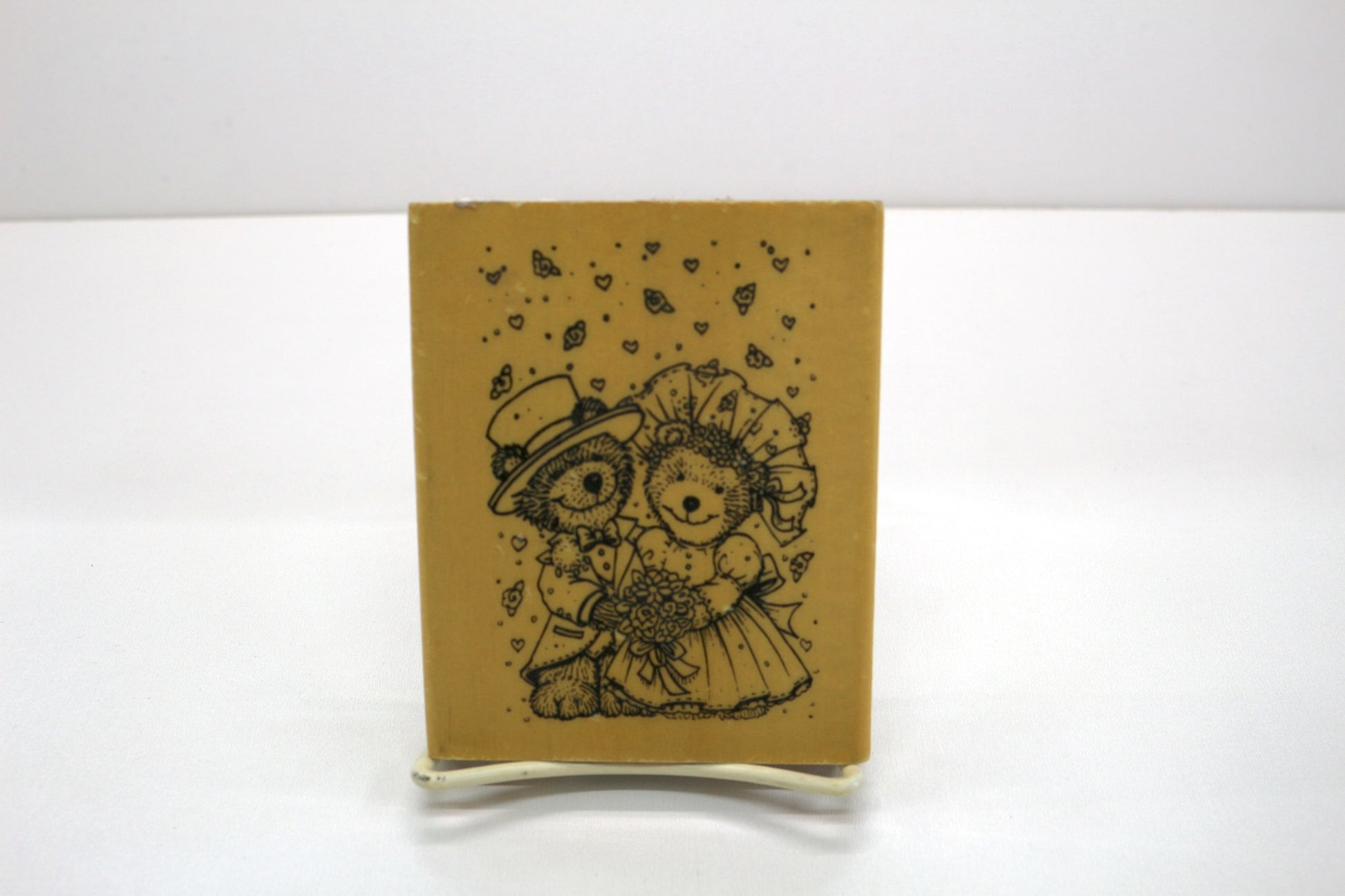Celebrate love the crafty way! This charming vintage wedding teddy bear rubber stamp features an adorable bride and groom surrounded by floating hearts — the cutest addition to handmade wedding cards, anniversary tags, junk journals, or scrapbooking layouts.